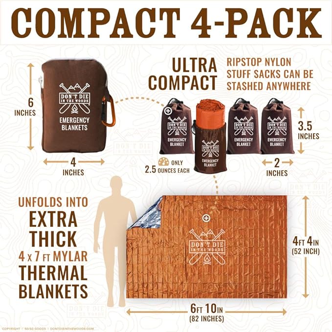 - TOUGHEST EMERGENCY BLANKETS ON EARTH – Exclusively from Don’t Die In The Woods, our HeatFlex mylar is thicker and more flexible than ordinary space blankets. Combined with durable packaging designed ultralight & compact for outdoor adventures, you won’t find tougher mylar emergency blankets anywhere.