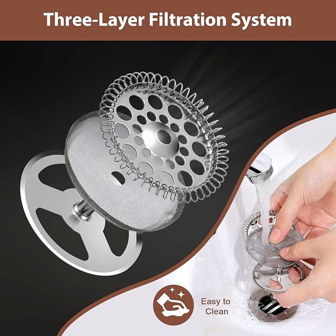 - Stainless Steel Filter : The Meelio large french press has a three-layer filter system, which can lock the natural oil and flavor of the coffee and filter out the coffee grounds. Two additional stainless steel filters are included, you can stack two or more filters to meet your own preferences.