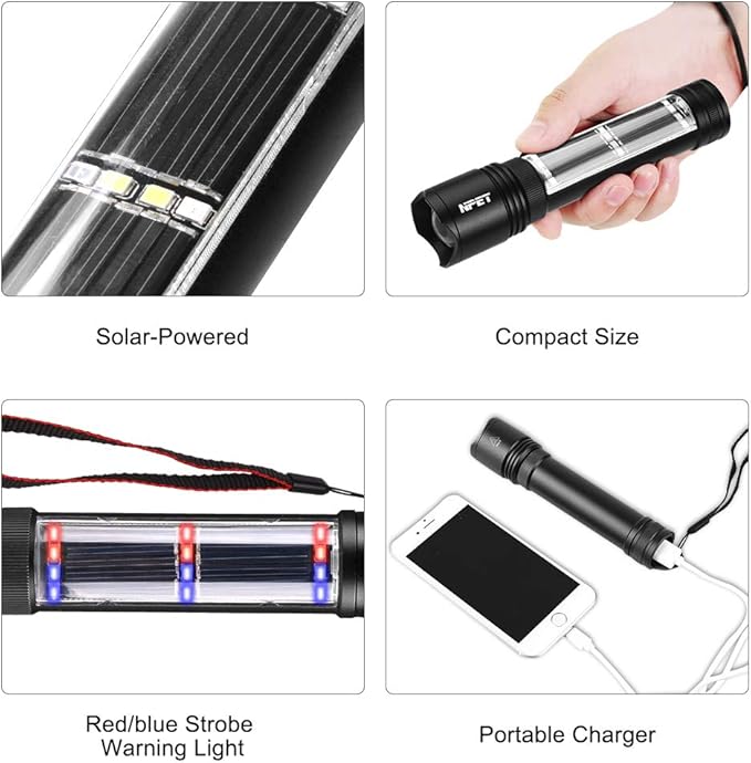 - 【Rechargeable Power Bank】: This solar flashlight could be charged with included USB Cable (4-5hrs) or Solar Power (30hrs), using the USB cable to connect your phone with the flashlight (The battery needs to be greater than 20%)and charging your phone for emergency.