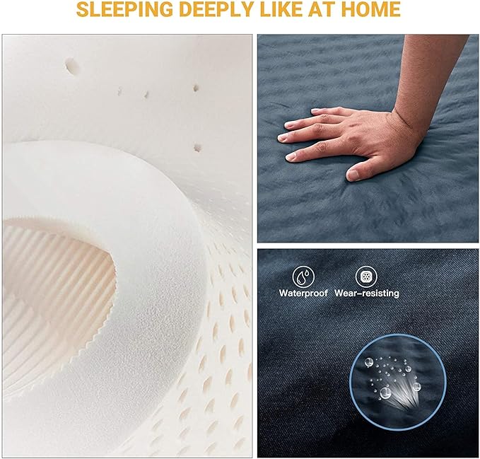 - QUALITY FABRIC CAMPING INFLATABLE MATTRESS - Designed for happy adventures, our camping air mattress is made from 100% polyester fiber, striking a unique balance between lightweight portability and durability. With thermoformed sealing, it performs exceptionally well in severe conditions, helping you say goodbye to back pain.