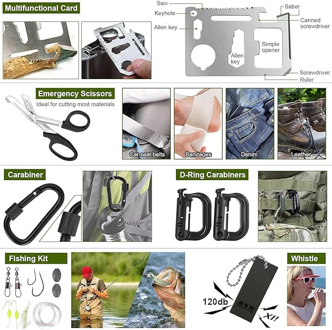 - Premium & Durable, flashlight, pen, bracelet, compass, whistle, fishing equipment set, etc.