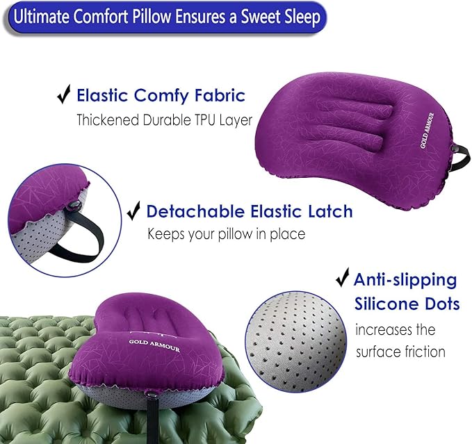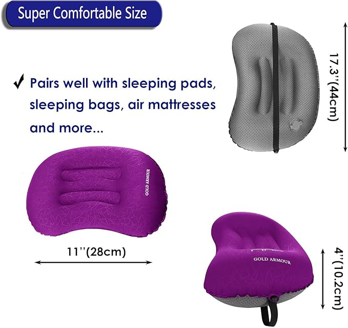 Gold Armour Inflatable Camping Pillow Backpacking Pillow Lightweight Travel Air Pillow Ultralight Ergonomic Pillow Portable for Airplanes with Neck & Lumbar Support (Purple)