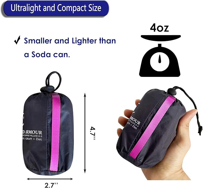 - WEIGHS ONLY [4 OZ] AND PACKS DOWN TO SMALLER THAN A SODA CAN - PERFECT FOR A BACKPACKING Pillow! No worrying about the room in your backpack with this very convenient ultralight inflatable pillow. Inflated size for this camping travel pillow is 17.3in (L) x 11in (W) x 4in (H)
