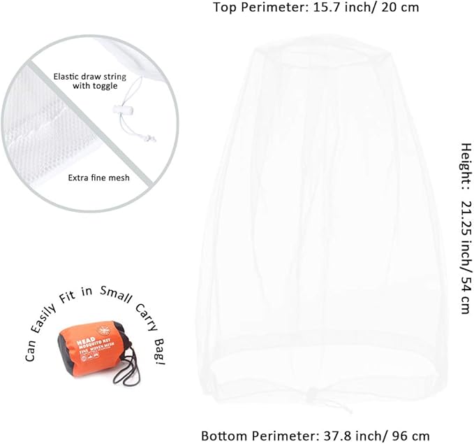 - ROOMY SIZE- Updated bigger size with 21.25 inch/ 54 cm in height, bottom perimeter is 37.8 inch/ 96 cm; top perimeter is 15.7 inch/ 40 cm(approx.) Works over wide or narrow brimmed hats, caps, etc.Neck drawstring from the bottom of the head net mesh allows adjustment to really keep the little buggers out and comfortable wearing.