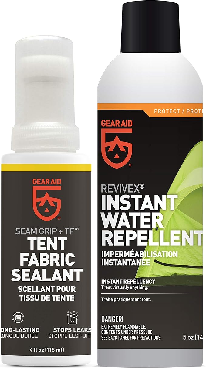 • Stop leaks in your rainfly, tent seams/floor with a GEAR AID Tent Waterproofing Kit; all kits include Revivex Instant Water Repellent, a breathable, silicone-free formula