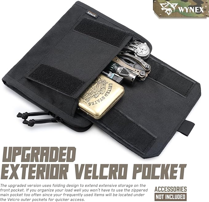 - FRONT HIDDEN POCKET: Molle Admin Pouch has a front compartment with Hook-N-Loop closure, front exterior has a large compartments with a magic sticker flap closure to ensure your items well organized and strong loading capacity