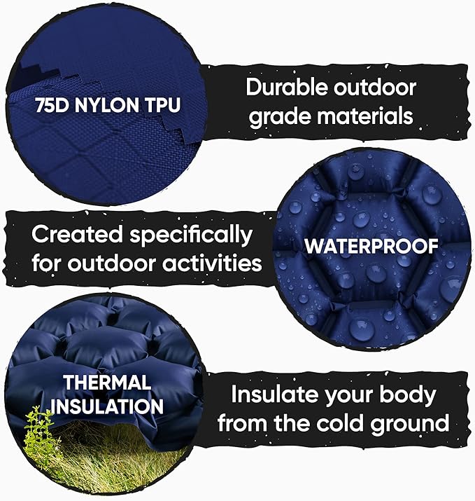 - UNIQUE LONGLASTING DURABILITY: It's the mat of all mats! The Inflatable sleeping pad is made of durable, outdoor grade materials. It includes thermal insulation, to keep your body warm from the cold winter ground. Our camping sleeping mat is 100% waterproof, making it perfect for any outdoor activities. You can say goodbye to sore backs and other discomforts normally left by bumps and rocks underneath the floor of your tent!