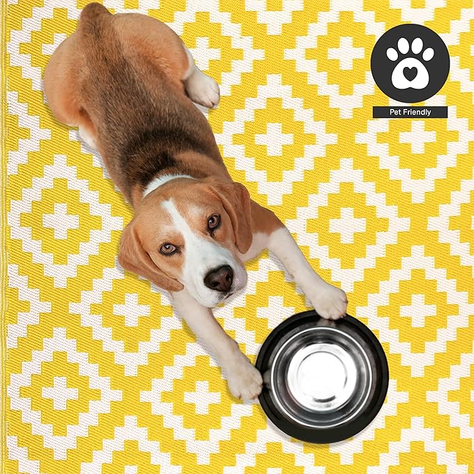 FH Home Outdoor Camping Rug - Waterproof, Fade Resistant, Reversible - Premium Recycled Plastic - Geometric - Large Patio, Deck, Sunroom, RV - Aztec - Yellow & White - 9 x 12 ft Foldable