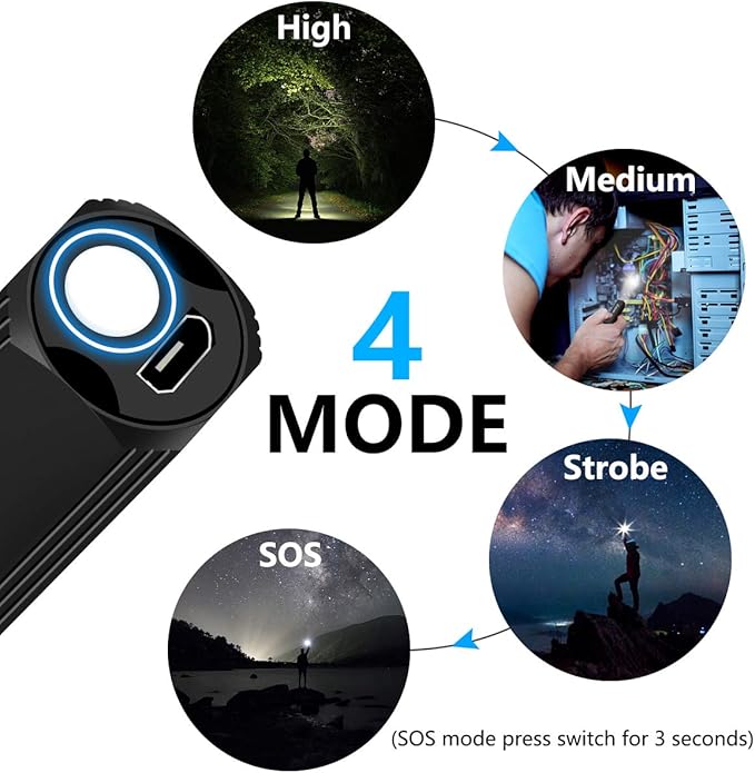 - 【4 MODES Flashlight】The LED Flashlight can emit strong light with the brightness up to 450 lumens (maximum) and the brightness range is up to 200 meters. There are also 4 brightness modes available, Bright/Dark/SOS/ Strobe, can be switched by the button.