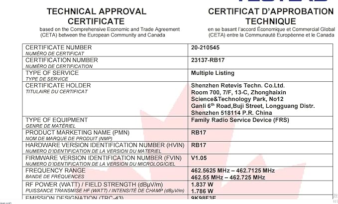 - 16 channels; license free walkie talkie; out of the box and easy to use; compatible with Retevis RT22; RT68; RT21; RT17; Hardware Version Identification Number is RB17; and the certification number is 23137-RB17