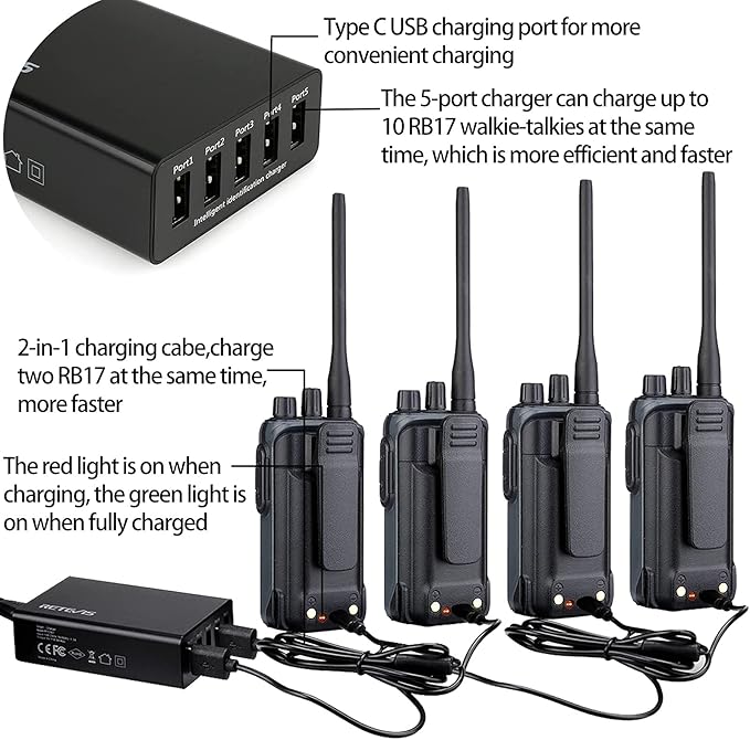 - The space saving 5-port charging station to charge is quick and easy; wall plug and a usb-a to 2 usb-c out output cable can charge two radios at the same time; charged within a few hours back to full charge; when fully charged; the indicator light turns from red to green
