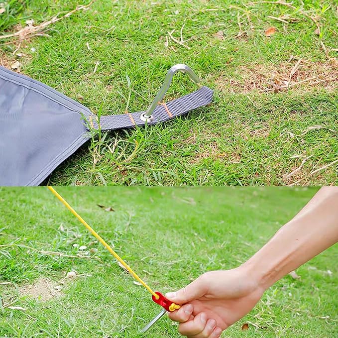 - ✅ ALUMINUM ADJUSTERS -- Each reflective cord has an aluminum tensioner which can adjust the rope's length according to your actual needs. The camping stakes help settle your tent and tarp easier and more convenient