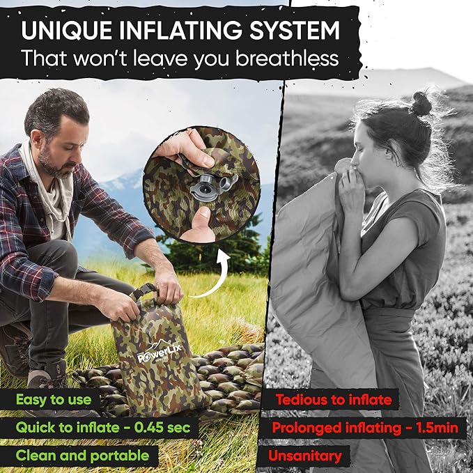 - REJUVENATE YOUR BODY: Powerlix camping pad has revolutionary hexagon design made with body mapping technology. The hexagon air cells ergonomically support all of your pressure points, giving you superior support and comfort all night long, no matter how you sleep! The sleeping mat is also a camping gear must haves luxury, being comfortable yet lightweight. It rolls up small, making it effortless to carry around. The cot comes in a variety of color choices, sure to match anyone's personality.