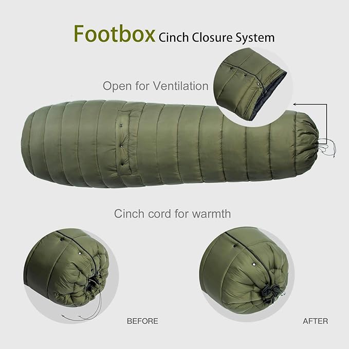 - COZY FOOTBOX INCLUDED. This top quilt can also be used as a sleeping bag with its convertible footbox. This is engineered to enhance warmth, comfort, and efficiency to provide extra insulation for your feet. Have the option to increase the airflow on warm nights by keeping the footbox open, while cinching the cord is best for cold sleepers and cold-weather adventures.
