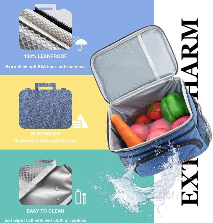 - LEAKPROOF & EASY TO CLEAN: The lunch bag is made of ultra-thick EVA soft lining and hot-welded seams without any needle holes to prevent leakage. The lunch bag is easy to clean. If the sauce spills inside, please wipe it off with a damp cloth or napkin. With heavy-duty Oxford cloth and superb tailoring technology, the adult lunch bag is dustproof, waterproof,and keep your food clean.