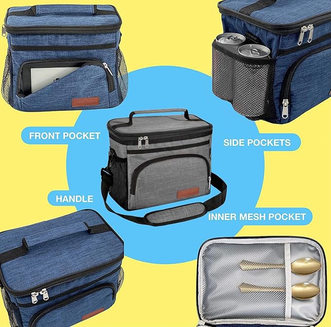 - LARGE CAPACITY & MULTI COMPARTMENTS: The insulated lunch bag is 10 x 6.7 x 8 inches,and the main zipper compartment is designed to provide you with lunch and hot/cold/fresh drinks. The front zipper pocket can store keys, cards, napkins and phone chargers. Two mesh pockets for water bottles and an inner mesh bag for knives, forks and spoons are perfect for packing all food and snacks all day long.