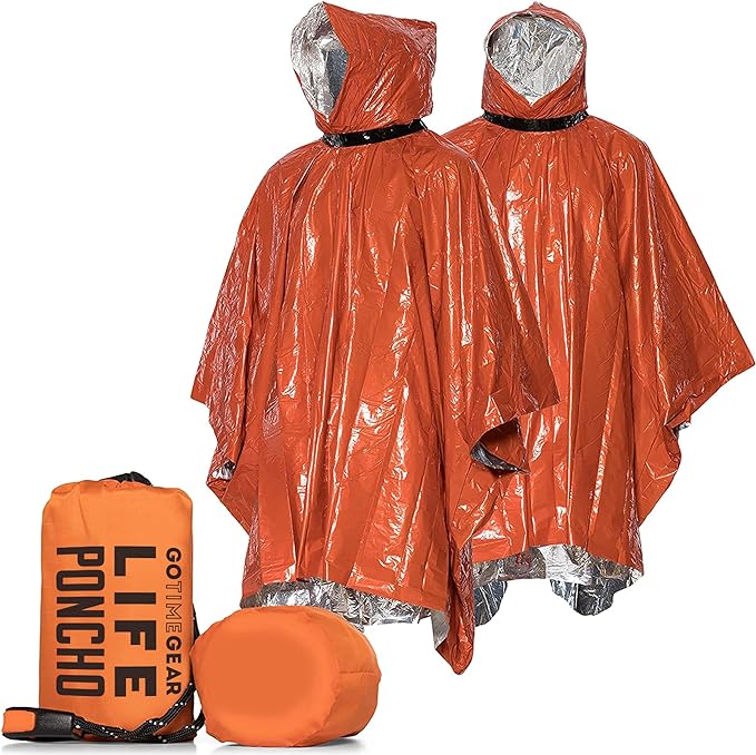 Go Time Gear Emergency Survival Life Poncho 2 Pack - Thermal Use in Camping, Survival Gear - Includes Whistle & Paracord