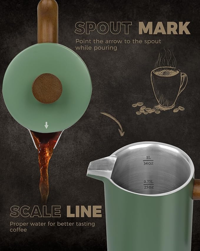 POLIVIAR French Press Coffee Maker, 34 oz Coffee Press with Real Wood Handle, Double Wall Insulation & Dual-Filter Screen, Food Grade Stainless Steel for Good Coffe and Tea (Flatland)