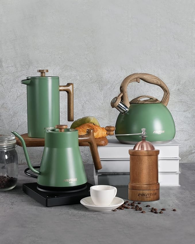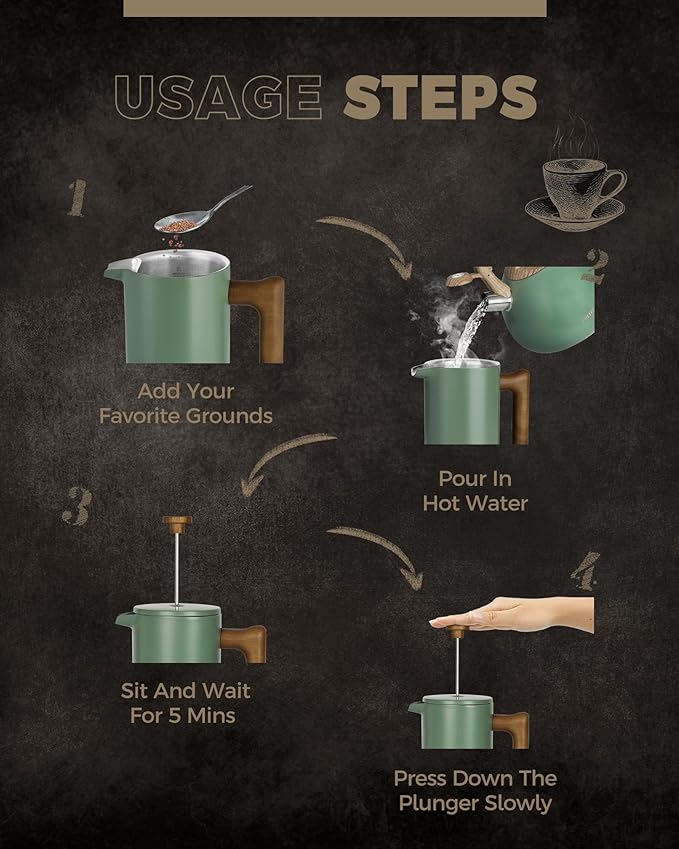- LOOKING FOR COFFEE PRESS FOR MATCHING UP YOUR KITCHEN? We, the POLIVIAR french press coffee maker will be your smart choice. While the coffee pot is made from food grade stainless steel with stylish long-lasting coating, It is easily to match up your kitchenwares and your kitchen's theme. Also, the ergonomic handle with real wood will maximize the fantastic time of grounds you loved.