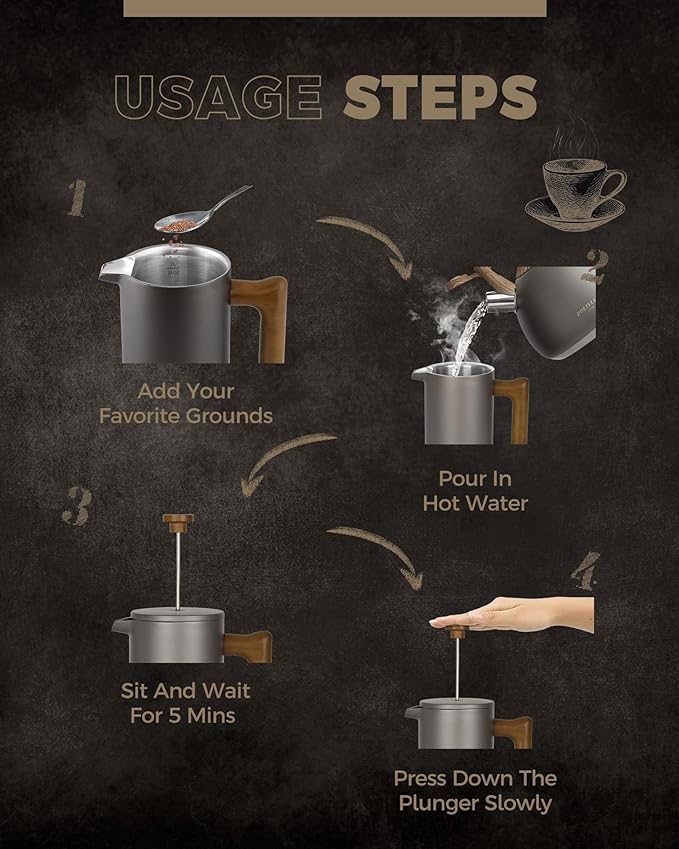 - LOOKING FOR COFFEE PRESS FOR MATCHING UP YOUR KITCHEN? We, the POLIVIAR french press coffee maker will be your smart choice. While the coffee pot is made from food grade stainless steel with stylish long-lasting coating, It is easily to match up your kitchenwares and your kitchen's theme. Also, the ergonomic handle with real wood will maximize the fantastic time of grounds you loved.