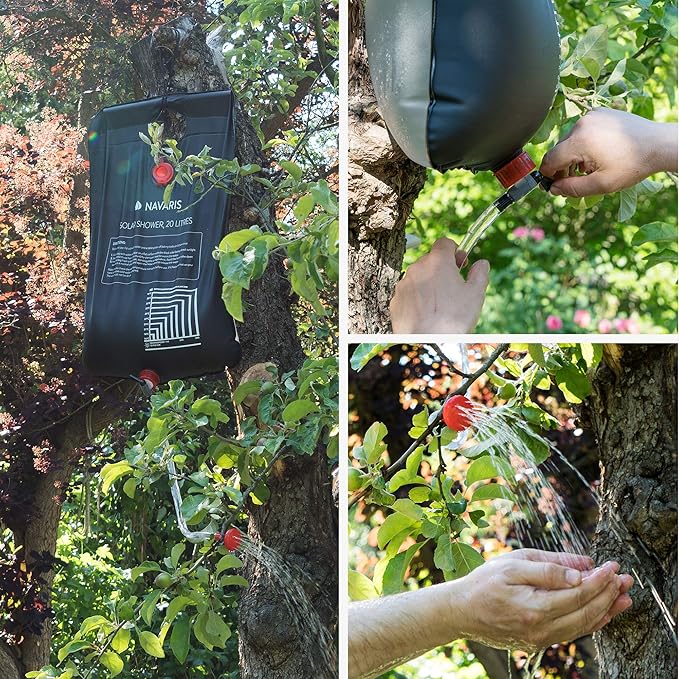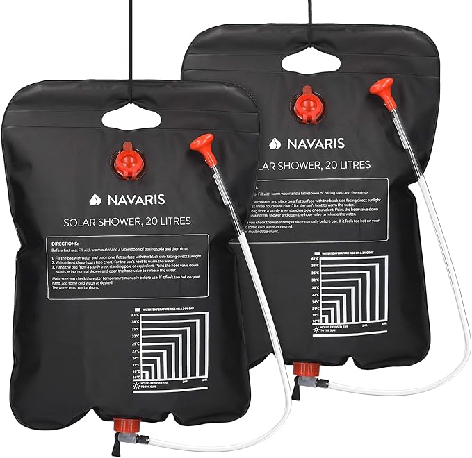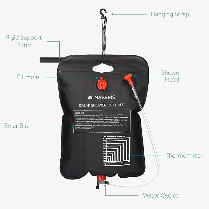 - CAMPING TO GLAMPING: If you want the home comfort of a shower while out camping or at a festival, use the Navaris Solar Shower Bag for just that. The PVC material absorbs solar power from direct sunlight to heat up the water inside the bag.