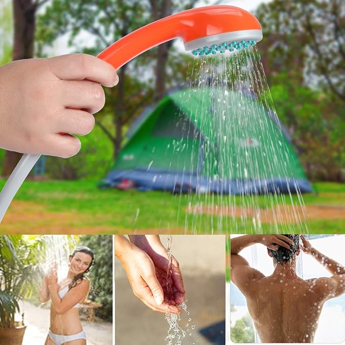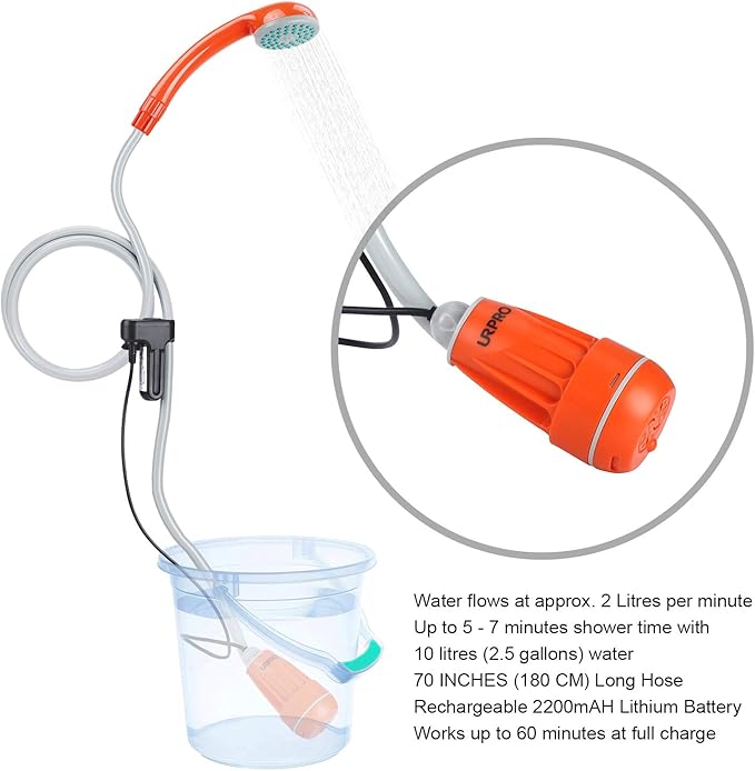• POWERFUL - This camping shower head can work for up to 45-60 minutes with a full charge of continuous use. The water flow is up to 2 litres per minute and up to 5-7 minutes shower time with 10 litres (2.5 gallons) water. It offers ideal and powerful water pressure so you can enjoy your shower even in remote campsites.
