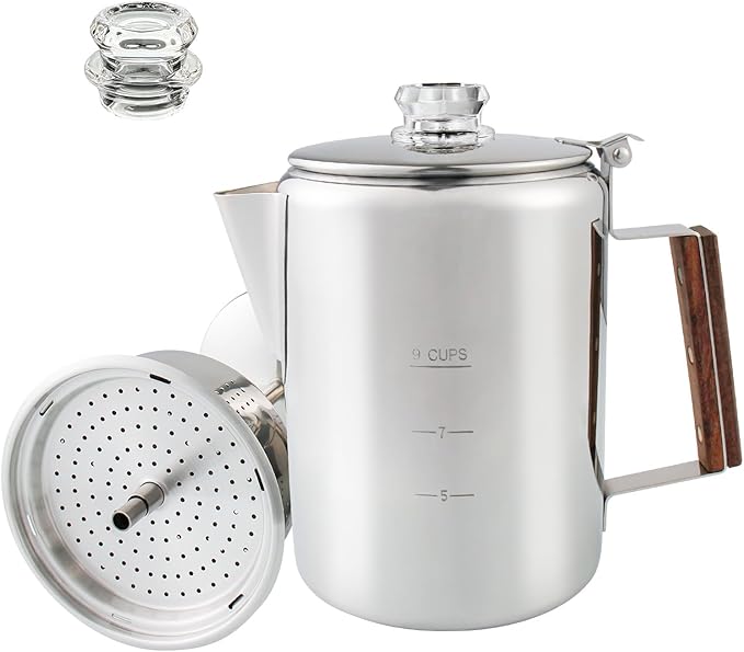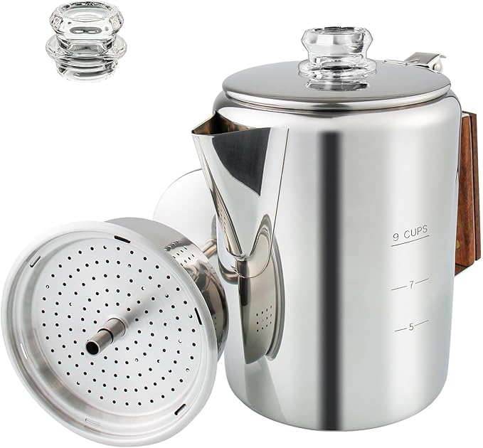 Coffee Percolator Camping Coffee Pot Stainless Steel Coffee Maker with Two Heat Resistant Tough Glass Knob Using on any Stovetop Outdoor Traveling NO Aluminum NO Plastic (9 Cup)