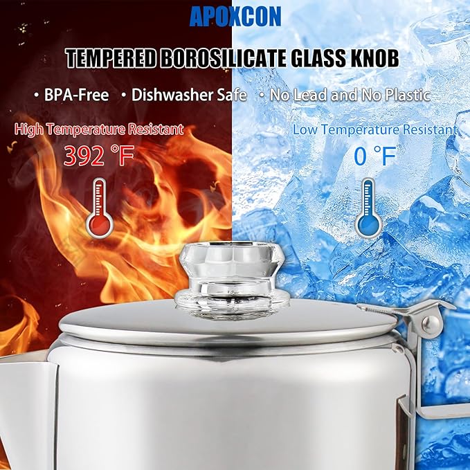 - TEMPERED BOROSILICATE GLASS KNOB - This coffee percolator comes with two tempered borosilicate glass knobs. The tempered borosilicate glass knob can not only withstand temperatures from 0 ° F to 392 ° F, but also has stronger pressure resistance than simple glass, making it reliable and safe to use.