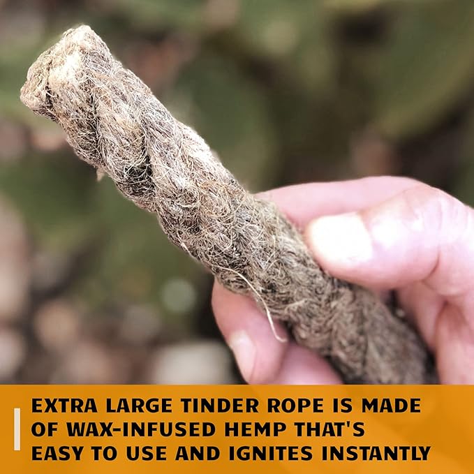 - EXTRA LARGE TINDER FIRE STARTER ROPE INCLUDED | Includes a proprietary wax-infused natural hemp tinder is a waterproof fire starter. Easy to use, it instantly ignites from the sparks of the ferro rod.
