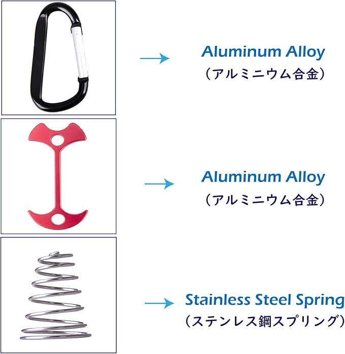- ✅ MATERIAL -- The deck tent stakes and carabiners are made of high-quality aluminum alloy, durable, corrosion-resistant. Repeated use of stainless steel spring is not easy to deform, high elastic and more firm.