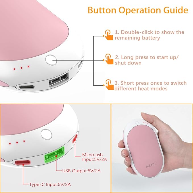 - 【High Capacity】Quick hand warmer 2-in-1. Built-in rechargeable batteries can heat up long-lasting to 12-16 hours on medium tempeture.Compared with 5200mAh, its heating duration can be extended by 6 hours.When you holding the hand warmers,Bring you back to the summer again.