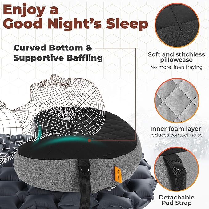 - Curved bottom and Supportive Baffling - This backpacking pillow providing great support for head and neck, ergonomic for sleeping. Also useful as a lumbar support pillow for back support. This Aluft Deluxe Pillow is the dream gear for every camper and backpacker