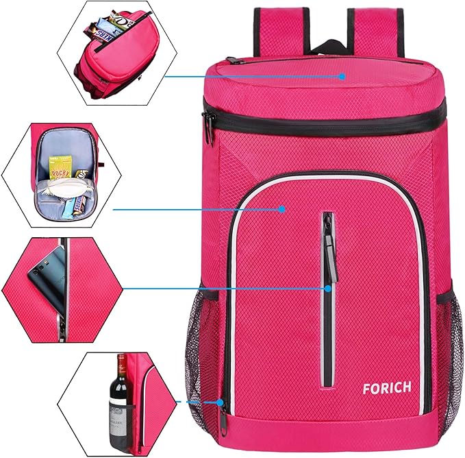 - ROOMY CAPACITY BACKPACK COOLER: 30 cans/30L, measures: 17" x 12" x 8". FORICH cooler backpack is large enough to organize all your necessities, such as drinks, beer, fruit, ice pack, meals, tall beverages, snacks, cellphone and so on. Also it can hold 2 bottles of wine on side pockets.