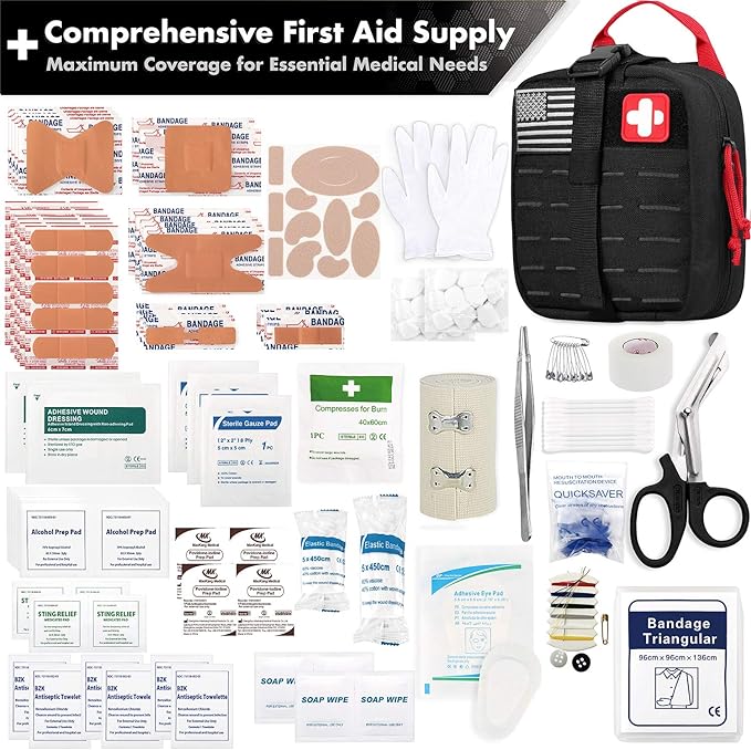 - ✅【Most Advanced First Aid Survival Kit & IFAK】 Upgraded from the best-selling EVERLIT Survival First Aid Kit, improved by the Army Vets, field-tested by the Ex-Army Sergeant. The most comprehensive, advanced, quality Medical Survival Kit on the market, comprises essential first aid supplies and high-grade survival tools packed in a Mil-Spec Molle System Compatible tactical pouch. Perfect for camping, hunting, hiking, boating, outdoors, field trip, home, office, and car.