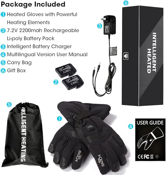 - ☀️[What You Get] heated gloves, 7.4V 2200mAh rechargeable batteries, gift box, storage bag, US standard dual charger, multilingual version manual, our worry-free 12-month warranty and 7/24 personal customer service. If you have any questions, please feel free to contact us. We've been here.