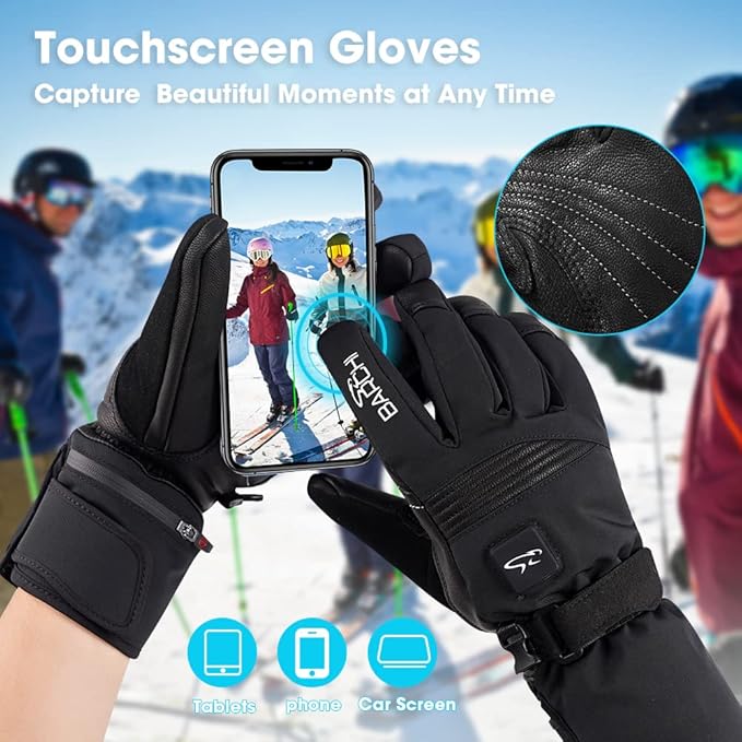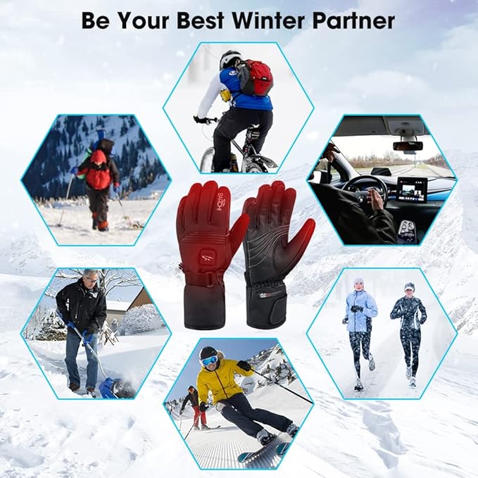- ☀️[Touchscreen Design] Heated ski gloves designed the conductive touch screen on the index finger allows people with joint stiffness to type words without taking off winter gloves. Especially suitable for motorcycling, running, cycling, hiking, camping, climbing, skating, skiing, snowboarding, ice fishing, hunting, cleaning snow, walking dogs, etc.