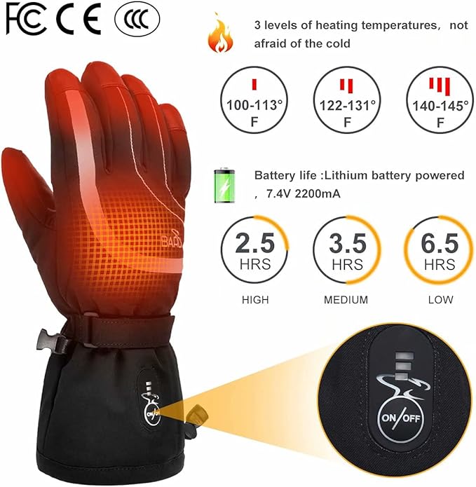 - [3 Heating Levels] Built-in composite heating element, the rechargeable heated gloves will heat our cold hands and fingers in a few minutes. To have more choices, our men and women heated gloves have 3 levels of heating (high, medium and low). No need to worry about the cold winter, our whole hands will remain warm and comfortable with the electric heated gloves