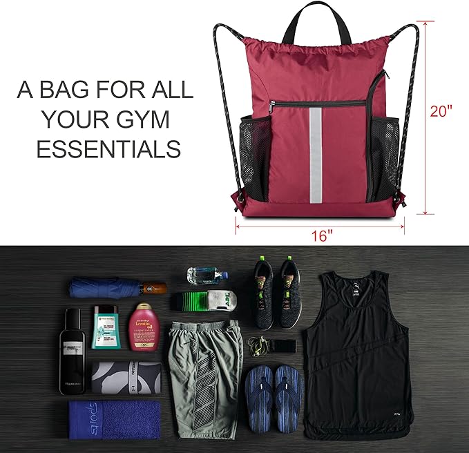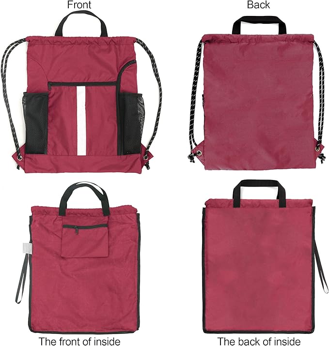 - Convenient Compartments: The big shoe compartment on the right side of gym drawstring bag can hold two pairs of shoes. The front zipper pocket is roomy to fit a kindle, iPad, sunglasses, and other small items. The inside pocket can hold small valuables such as wallet, cellphone, keys to avoid any pickpockets. And two mesh pockets can carry water bottles, umbrella, sunscreen. Etc. This drawstring sports bag also can be used to store small items.