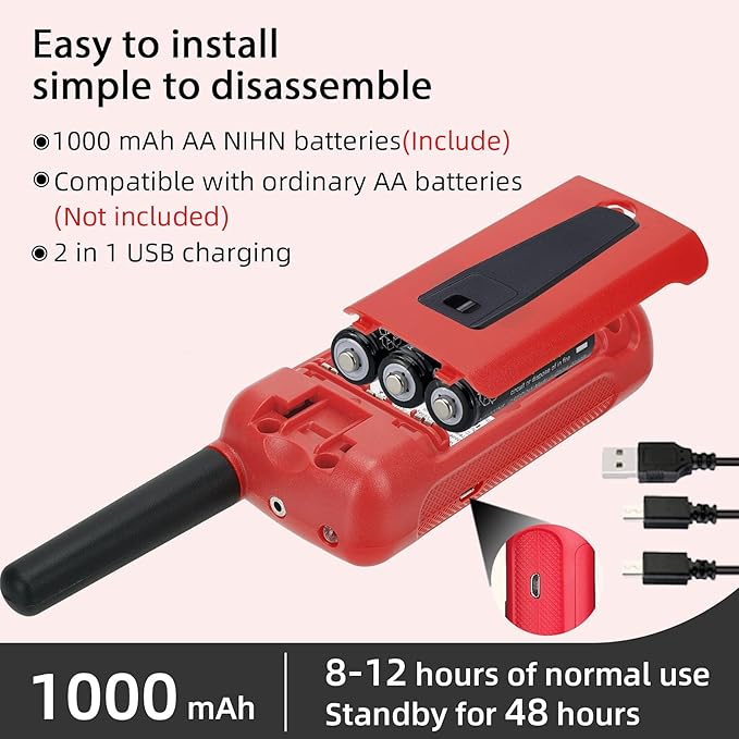 - Rechargeable walkie-talkie; come with 3*1000mAh AA NIMH batteries
