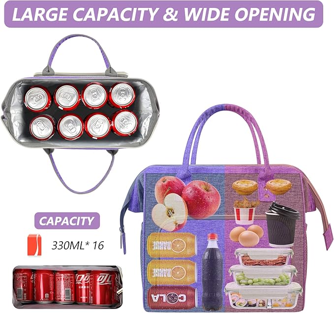 - Large Capacity Lunch Bag-Dimensions - 11"L x 6.7"W x 10"H. The large capacity bag and can fit 2 pcs lunch containers or 12+ cans. One front zippered pocket and back pocket for keys and cards. Two side pockets for water bottles, knives,forks and spoons. You can store your sandwichs, salad, snacks, drinks and fruits in one bag. Powerful organization ability to carry more foods easily to improve your daily life. Lunch bags for women, large lunch bags.