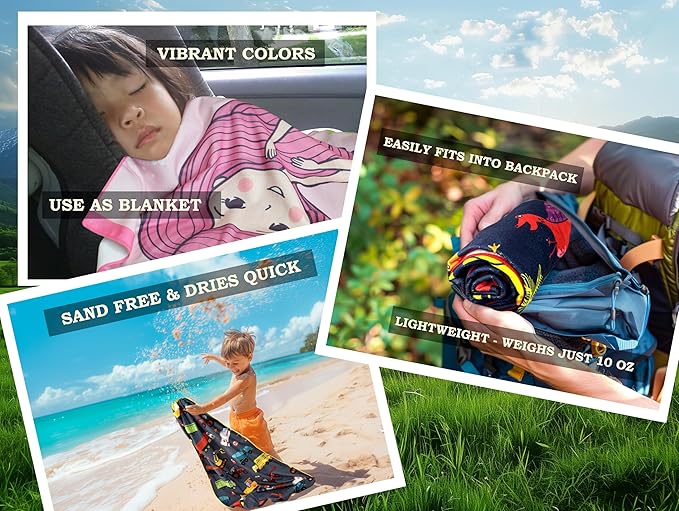 - WIDE USE - This is more than just a gorgeous beach bath towel and soft portable blanket; It is suitable for use at home, beach, pool, swimming, picnic, sleepover, travel, vacation, cruise, exercise, gym, fitness, camping, hiking, yoga, outdoor, water park, tennis, sports, sporting events, etc; It is a multi-purpose towel and a wonderful gift for little ones