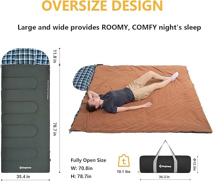 - EXTRA LARGE & SPACIOUS-Comfort for Big & Tall Individuals: The KingCamp sleeping bag is designed to provide ample room for bigger individuals. Measuring 90.5” x 35.4”, this extra-large sleeping bag gives you plenty of space to move and stretch, ensuring you can sleep soundly and comfortably no matter your size. Perfect for big and tall individuals, it offers a spacious and comfortable environment for a restful night.