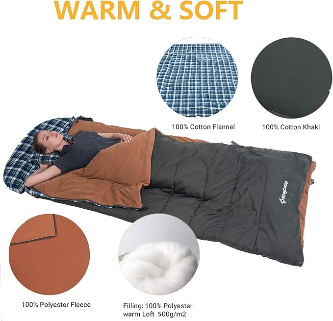 - COZY FLANNEL LINING-Soft, Warm, and Durable: The plush flannel lining of this sleeping bag provides a soft, cozy, and durable experience. It ensures that you stay comfortable and warm after a long day of outdoor adventures. The outer layer is made from waterproof polyester, moisture-wicking, breathable, and non-static. This sleeping bag is machine washable and easy to care for, making it perfect for outdoor enthusiasts who need both comfort and practicality.