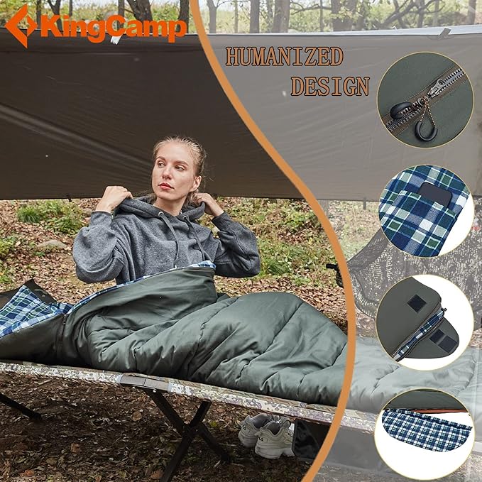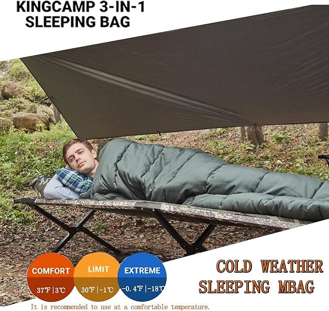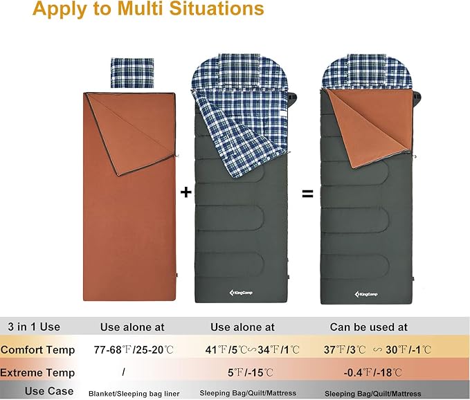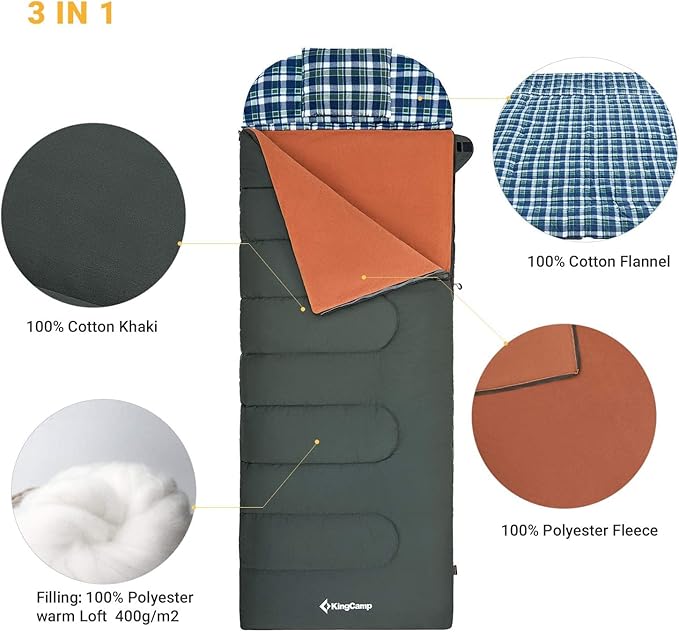 KingCamp 3-in-1 Sleeping Bag for Adults Cold & Warm Weather, XL Size for Big & Tall Individuals, Waterproof, Flannel Lining, Extra Length-Ideal for Camping & Backpacking