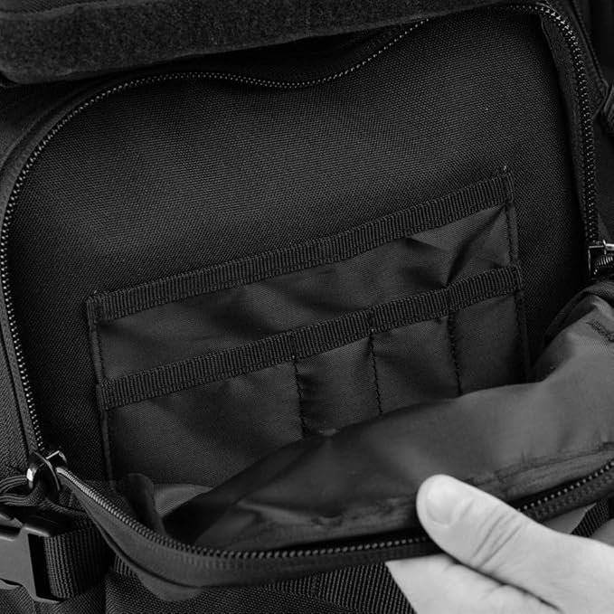 - Military backpack is Made of 600x600 Density fabric, Tactical Backpack is Reinforced and Double Stitched at all stress Points. Tactical Backpack There are 2 main compartments, 2 small compartments in front, and a back compartment for a hydration bladder (backpack didn't include hydration bladder). Each of the compartments has variety pockets to help with organization. Molle Backpack Webbing System on Front and Sides Ensures you Can addTactical MOLLE gear and Pouches as Needed for any Mission.