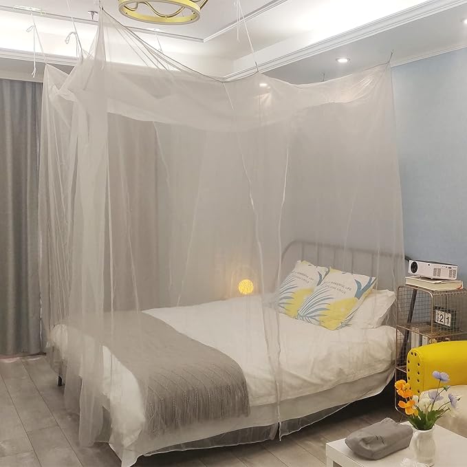 - Pack: The 8 points hanging system don' t require special skills, for home and travel. You can hang it from the corners of your four-post bed or any tree branch for an added touch of style and elegance. The height can be adjusted freely according to your needs. When it's set up properly, it is a large box-shape, and definitely big enough to cover a full-sized mattress. Extra string and a carry pouch. Super lightweight and easy to travel within your carry-on luggage.