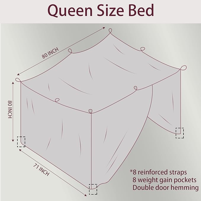 - Sizes: 80” L x 71” W x 80” H, 24oz/680g. Suitable for queen size bed. This premium big mosquito net is bigger than most other nets to fit perfectly over outdoor tables and chairs, porch swings, cribs, picnic tables and more. The classic rectangular style design maximizes coverage with minimum weight and packaged size.