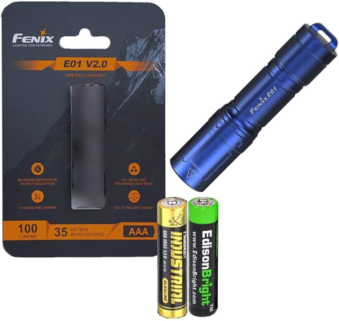 Fenix E01 V2 100 Lumen LED flashlight with EdisonBright AAA alkaline battery bundle (Blue)