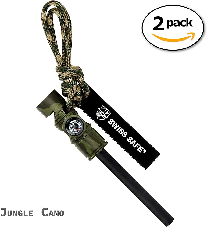 Swiss Safe 5-in-1 Fire Starter with Compass, Paracord and Whistle (2-Pack) for Emergency Survival Kits, Camping, Hiking, All-Weather Magnesium Ferro Rod
