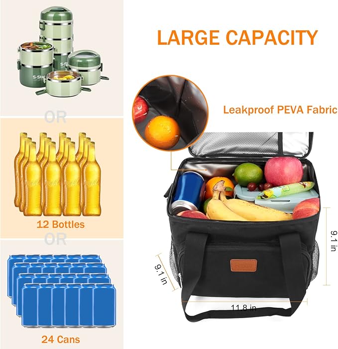 - 【LARGE CAPACITY】 -- The reusable lunch bag with big double zippers compartment is 11.8”L x 9.1”W x 9.1”H. The maximum capacity is 15, big enough to fit 24 tins of 330ml coke, wide-open square design can easily store your sandwiches, salad, drinks and fruits in this large capacity lunch bag. It can fit all your lunch need whole day and prefect to take foods and snacks with your outdoor activities.